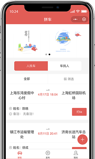 拼車模塊分車找人和人找車兩種模式,進入小程序后用戶只需要輸入自己的具體位置和目的地,將信息進行提交后,小程序會將發(fā)布信息上傳至平臺,尋找相匹配的私家車或者乘客。